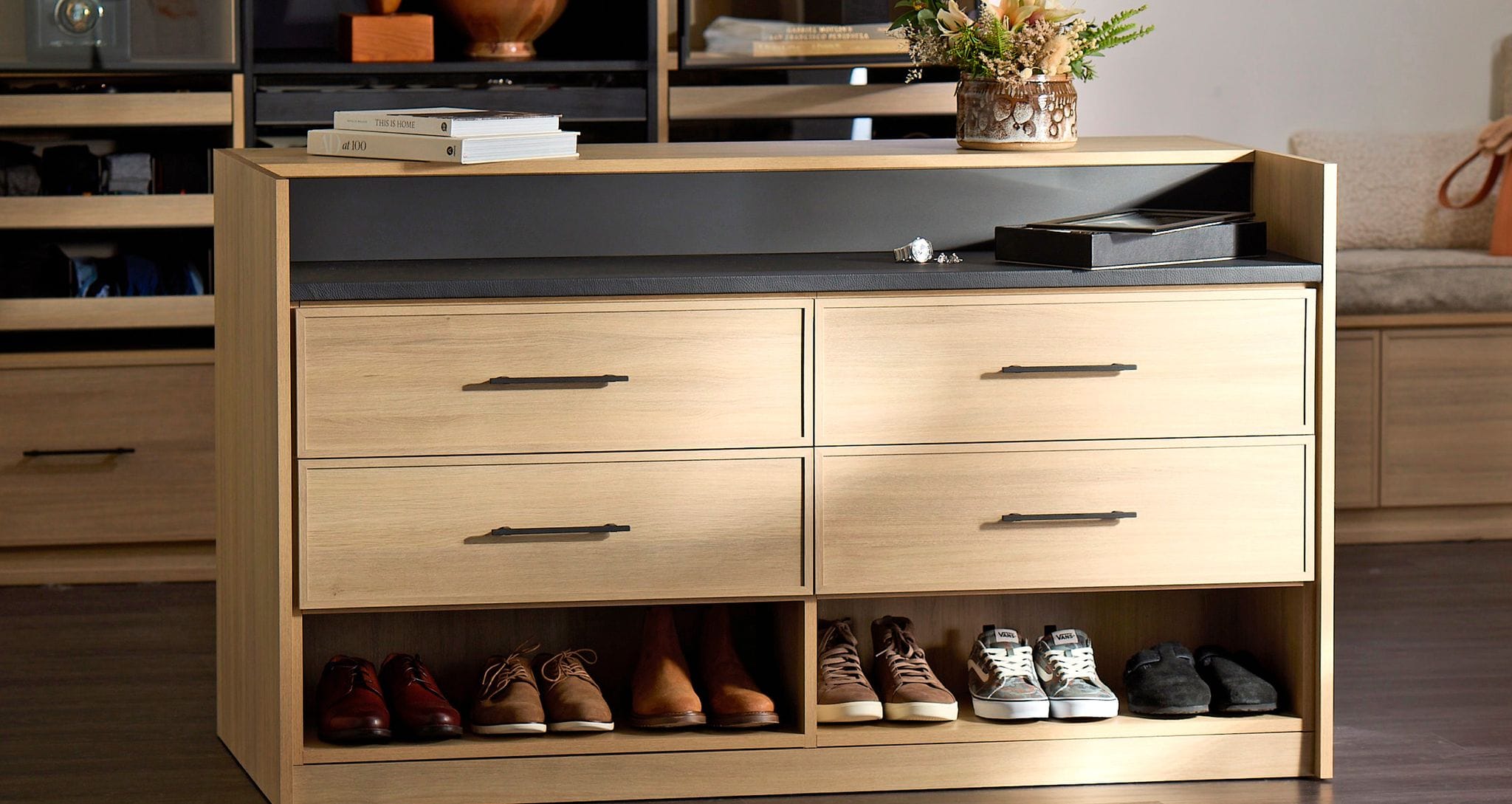Close up of storage drawers and countertop design by California Closets