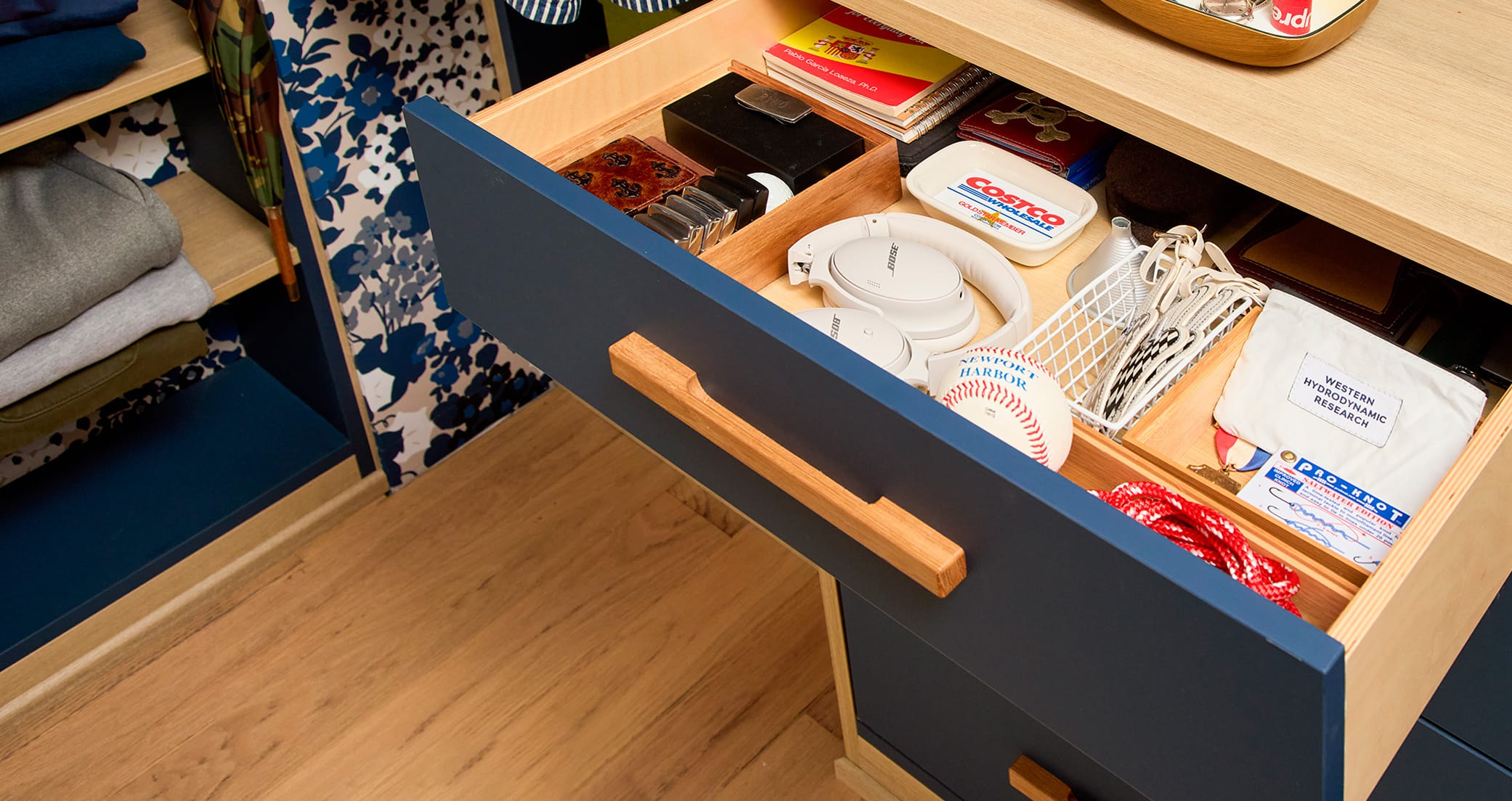 The solution? A custom closet in a neutral wood grain finish that offsets accents in deep blue. Visually appealing, the personalized design still packs in effective wall-to-wall storage for the couple, including shoe shelves and a built-in vanity area with deep drawers. To accommodate the space’s sloped ceiling, Kyrsti made sure to reflect the footprint with thoughtfully placed long-hang and double-hang areas.